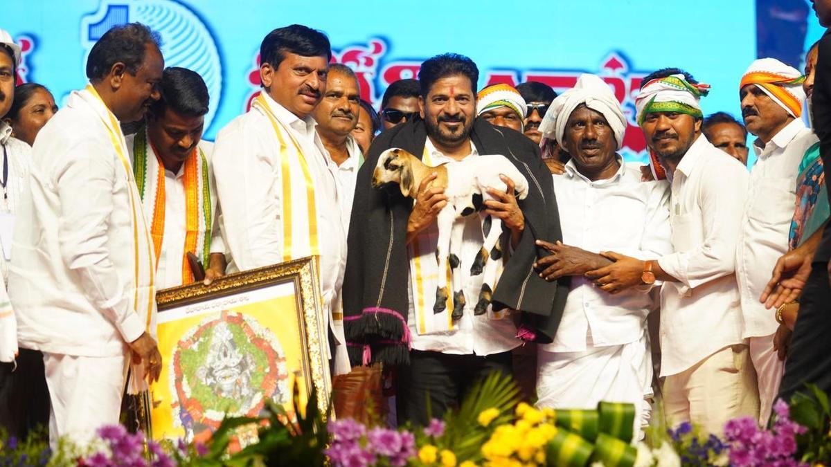रविवार को नगर निगम चुनाव के प्रचार अभियान के तहत भूपालपल्ली जिले में सार्वजनिक बैठक में मुख्यमंत्री रेवंत रेड्डी और अन्य मंत्री। | फोटो साभार: विशेष व्यवस्था