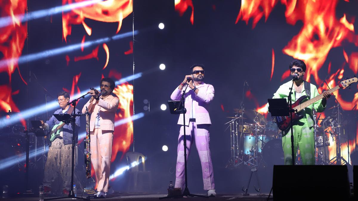 मंगलवार को वीआईटी-एपी विश्वविद्यालय में आयोजित ‘वीटोपिया 2026’ उत्सव में प्रदर्शन करता एक संगीत बैंड। | फोटो साभार: हैंडआउट