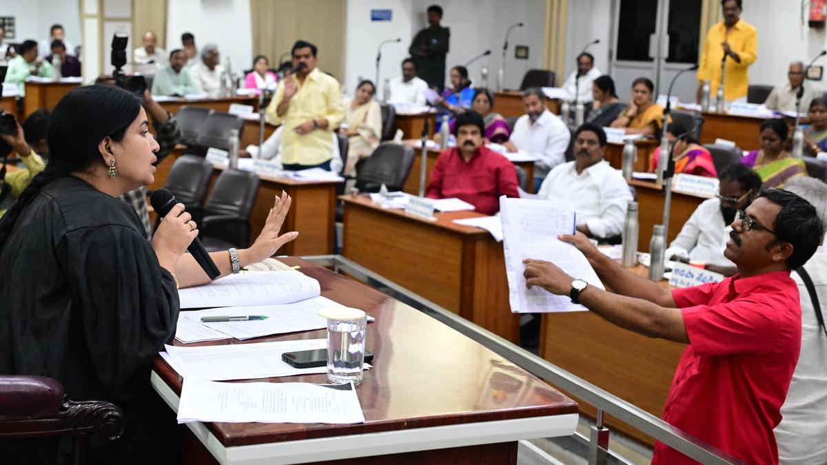 बुधवार को विजयवाड़ा नगर निगम परिषद की बैठक के दौरान मेयर रायना भाग्य लक्ष्मी पर आपत्ति जताते हुए सीपीआई (एम) के नगरसेवक बी. सत्य बाबू। | फोटो साभार: जीएन राव