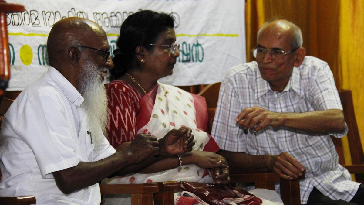 त्रिशूर में केरल साहित्य अकादमी के एक सेमिनार में पर्यावरणविद् माधव गाडगिल पर्यावरण कार्यकर्ता इंदिरा देवी और वीएस विजयन के साथ। | फोटो साभार: फाइल फोटो