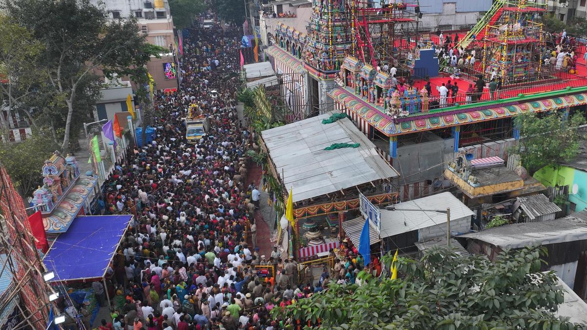 इसमें शामिल श्रद्धालु कुम्भाभिषेकम रविवार को चेन्नई के व्यासरपाडी में श्री रवीश्वर मंदिर में। | फोटो साभार: बी. ज्योति रामलिंगम