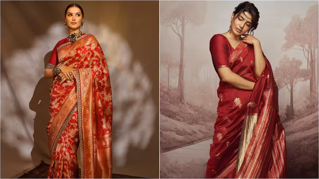 रकुल प्रीत सिंह सोने की ज़री के रूपांकनों और खूबसूरती से बुने हुए बॉर्डर से सजी इस समृद्ध लाल बनारसी रेशम साड़ी में बेहद खूबसूरत लग रही हैं। सुनहरे ब्लाउज और पारंपरिक आभूषणों के साथ, उनका चिकना जूड़ा और नरम ग्लैम मेकअप साड़ी की शाश्वत सुंदरता को उजागर करता है, जो उत्सव या शादी के अवसरों के लिए बिल्कुल उपयुक्त है। (छवि स्रोत: इंस्टाग्राम/रकुलप्रीत)