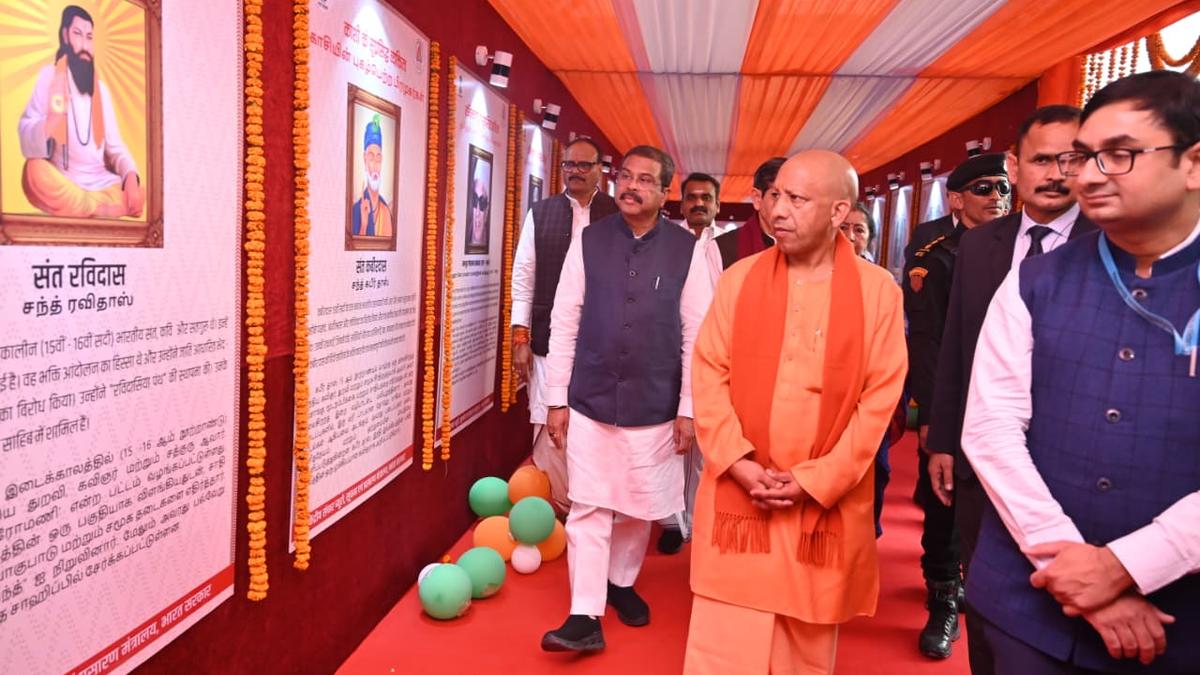 उत्तर प्रदेश के मुख्यमंत्री योगी आदित्यनाथ और केंद्रीय शिक्षा मंत्री धर्मेंद्र प्रधान ने मंगलवार को वाराणसी में ‘काशी तमिल संगमम’ का एक हिस्सा प्रदर्शनी देखी। फोटो: विशेष व्यवस्था