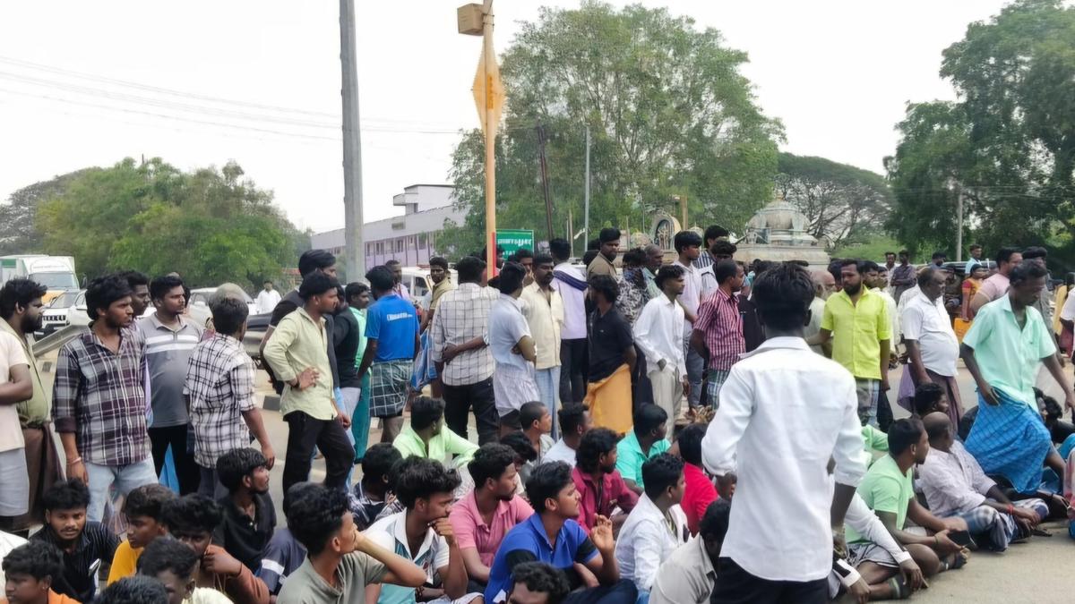 हिरासत में यातना के कारण कथित तौर पर मारे गए युवक आकाश के परिवार ने 8 मार्च, 2026 को मनामदुरै में सड़क रोको प्रदर्शन किया। फोटो साभार: विशेष व्यवस्था