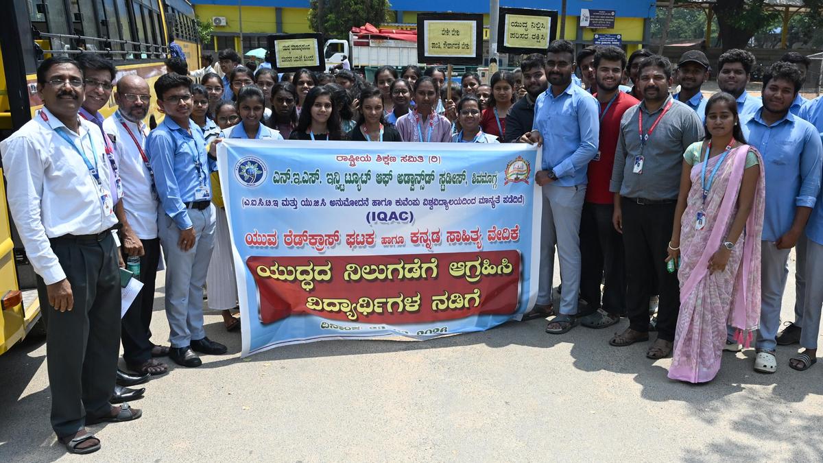शिवमोग्गा में एनईएस इंस्टीट्यूट ऑफ एडवांस्ड स्टडीज के छात्रों ने एक मार्च निकाला, जिसमें अमेरिका, इजरायल और ईरान से जुड़े युद्ध की निंदा की गई और युद्ध को समाप्त करने की अपील की गई।