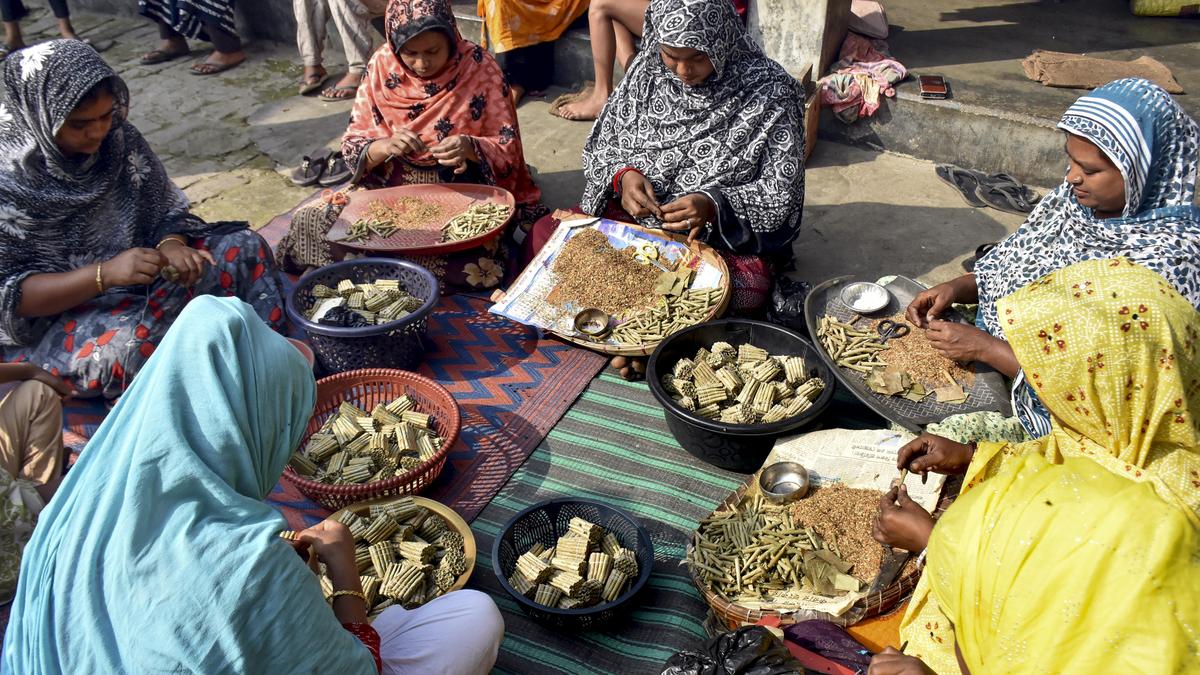 पश्चिम बंगाल के मुर्शिदाबाद के एक गांव में मजदूर बीड़ी बनाते हैं। | फोटो साभार: पीटीआई