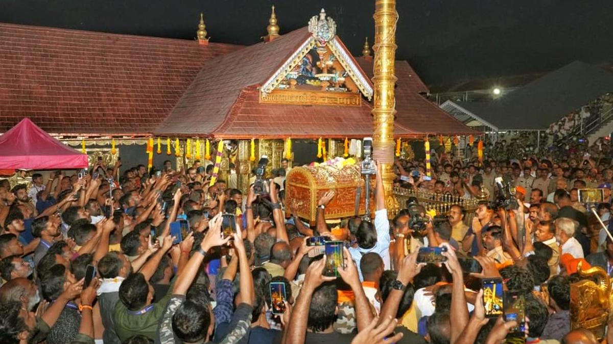 शुक्रवार को सबरीमाला सन्निधानम में थंका अंकी जुलूस का स्वागत किया जा रहा है। | फोटो साभार: लेजू कमल