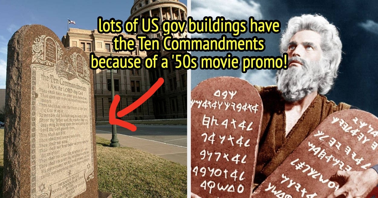 दस आज्ञाएँ निर्देशक सेसिल बी. डेमिले के प्रचार स्टंट के आज भी राजनीतिक निहितार्थ हैं। 1956 में, उन्हें पता चला कि फ्रैटरनल ऑर्डर ऑफ ईगल्स किशोर अपराध के खिलाफ एक उपाय के रूप में दस आज्ञाओं की प्रतियां वितरित कर रहा था। इसलिए, उन्होंने उन्हें देश भर में सरकारी भवनों के बाहर और सार्वजनिक पार्कों में प्रदर्शित करने के लिए दस आज्ञाओं वाली बड़ी पत्थर की गोलियाँ दान करने के लिए राजी किया।