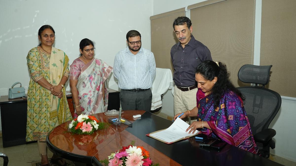जी श्रीजाना ने 11 फरवरी, 2026 को तीन नवगठित निगमों के विशेष अधिकारी जयेश रंजन की उपस्थिति में नवगठित साइबराबाद नगर निगम के आयुक्त के रूप में कार्यभार संभाला। फोटो साभार: व्यवस्था द्वारा