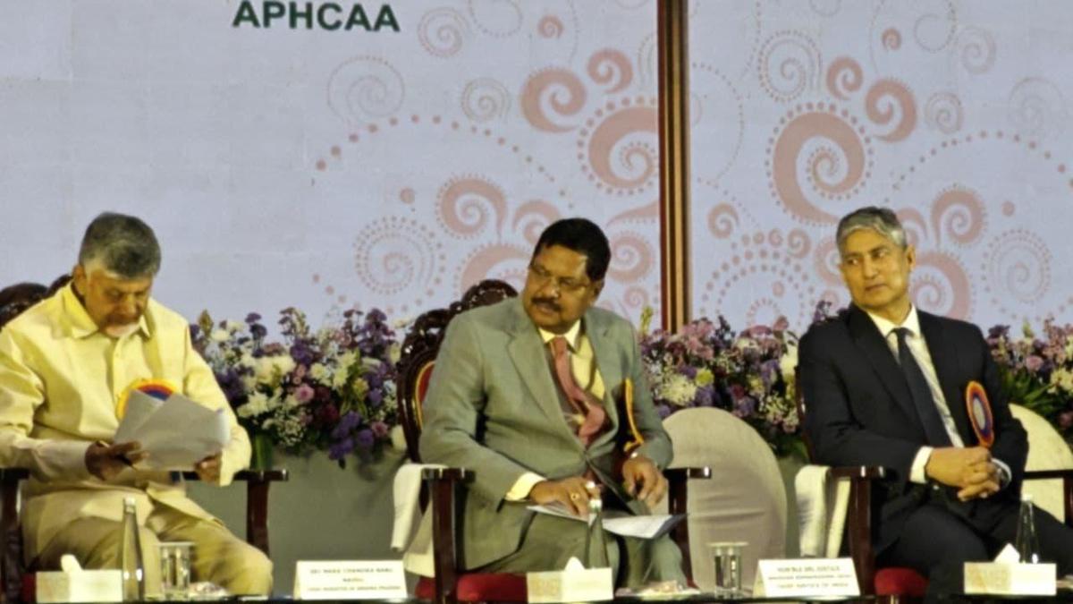 भारत के मुख्य न्यायाधीश बीआर गवई, आंध्र प्रदेश उच्च न्यायालय के मुख्य न्यायाधीश धीरज सिंह ठाकुर, और मुख्यमंत्री एन. चंद्रबाबू नायडू रविवार को मंगलागिरी में भारतीय संविधान के 75 वर्ष पूरे होने के उपलक्ष्य में आयोजित समारोह में शामिल हुए | फोटो साभार: व्यवस्था