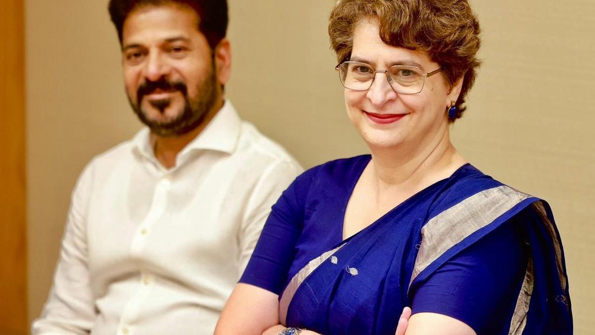 शुक्रवार (10 अप्रैल, 2026) को नई दिल्ली में कांग्रेस कार्य समिति (सीडब्ल्यूसी) की बैठक में कांग्रेस नेता प्रियंका गांधी के साथ मुख्यमंत्री ए रेवंत रेड्डी। | फोटो साभार: हैंडआउट