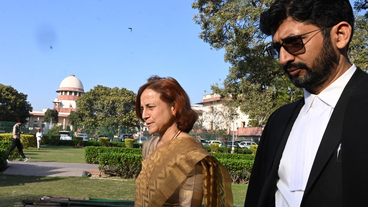 एचआईएएल की सह-संस्थापक और जलवायु कार्यकर्ता सोनम वांगचुक की पत्नी गीतांजलि जे एंग्मो गुरुवार को नई दिल्ली में सुप्रीम कोर्ट में मीडिया से बात करती हुईं। | फोटो साभार: सुशील कुमार वर्मा