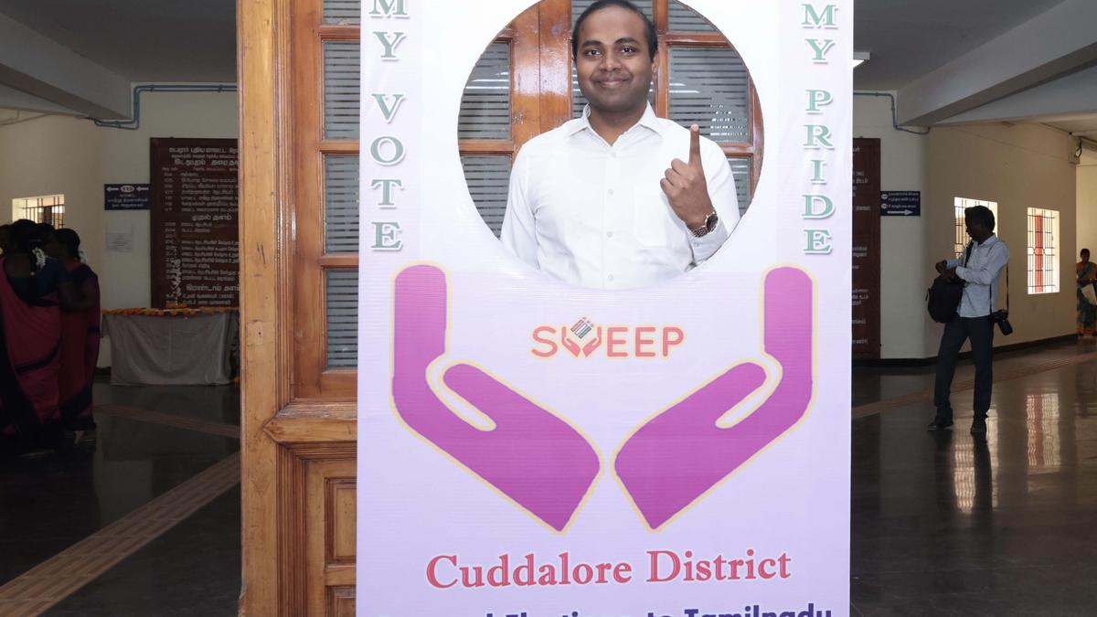 जिला निर्वाचन अधिकारी और कलेक्टर सिबी अधित्या सेंथिल कुमार बुधवार को कुड्डालोर कलक्ट्रेट में खोले गए ‘सेल्फी प्वाइंट’ पर पहुंचे। | फोटो साभार: विशेष व्यवस्था