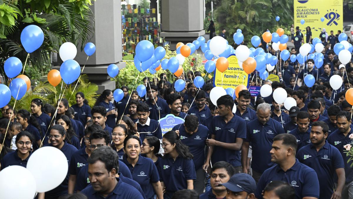 रविवार को हैदराबाद में डॉक्टर, कर्मचारी, छात्र और बच्चे विश्व ग्लूकोमा सप्ताह के हिस्से के रूप में एलवी प्रसाद आई इंस्टीट्यूट द्वारा आयोजित ग्लूकोमा जागरूकता वॉक में भाग लेते हैं, जल्दी पता लगाने और आंखों के स्वास्थ्य के बारे में जागरूकता फैलाने के लिए तख्तियां और गुब्बारे पकड़ते हैं। | फोटो साभार: रामकृष्ण जी