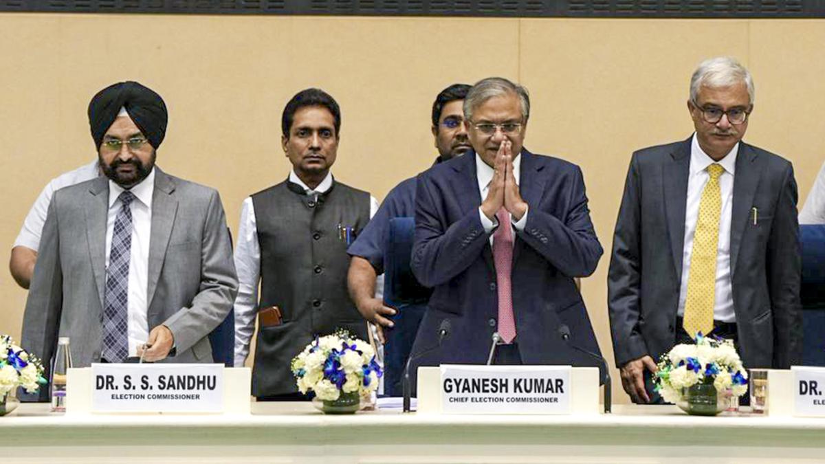 रविवार को नई दिल्ली के विज्ञान भवन में एक प्रेस कॉन्फ्रेंस के दौरान मुख्य चुनाव आयुक्त ज्ञानेश कुमार (सी) चुनाव आयुक्त एसएस संधू (बाएं) और विवेक जोशी (दाएं) के साथ। | फोटो साभार: पीटीआई