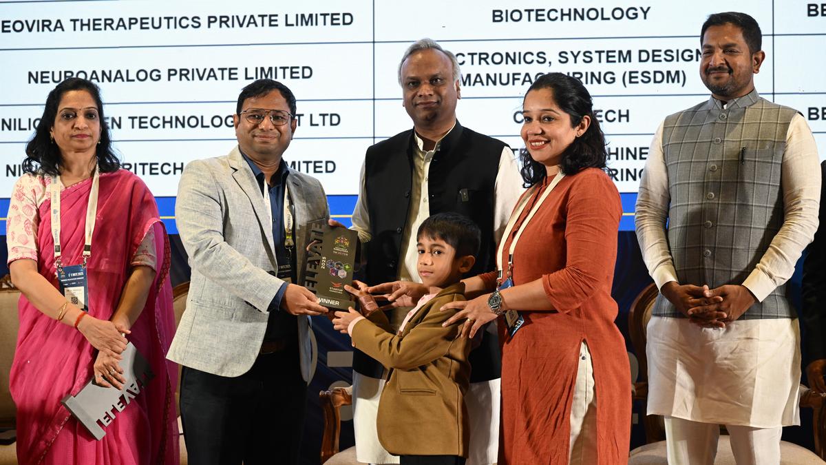आरडीपीआर और आईटी बीटी मंत्री श्री प्रियांक खड़गे, अन्य लोगों के साथ, शनिवार को बेंगलुरु के यूआर राव भवन में एलिवेट 2025 विजेताओं के सम्मान समारोह के दौरान विजेताओं को सम्मानित करते हुए। | फ़ोटो साभार: एलन एजेन्यूज़ जे