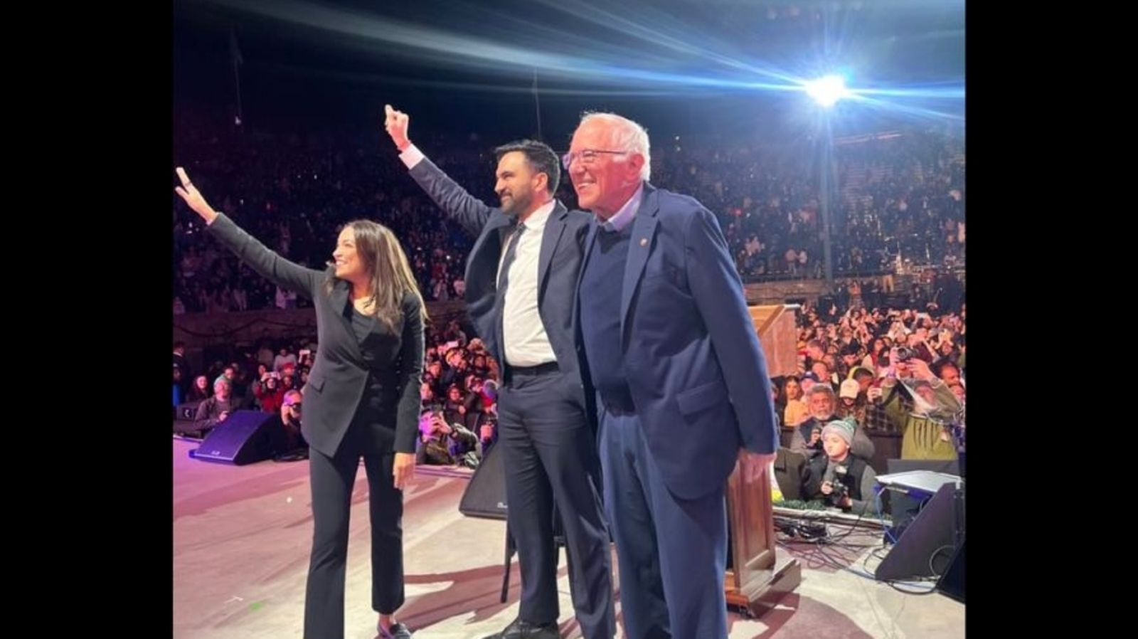 ममदानी ने रैली में उन तीनों की एक तस्वीर साझा की, जिसमें वह और एओसी भीड़ की ओर अपने हाथों से एक अजीब इशारा कर रहे थे। ममदानी ने फोटो के कैप्शन में लिखा, “धन्यवाद, न्यूयॉर्क सिटी। अब जीतें।”