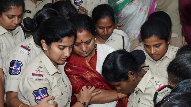 अनशनरत तेलंगाना जागृति अध्यक्ष कल्वाकुंतला कविता को पुलिस द्वारा स्थानांतरित किया जा रहा है | फोटो साभार: व्यवस्था द्वारा भूख...