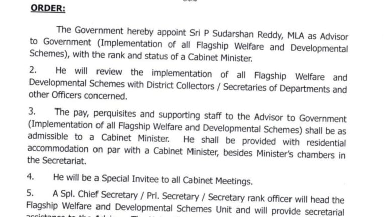 विधायक सुदर्शन रेड्डी को कल्याण और विकास योजनाओं के कार्यान्वयन के लिए सलाहकार नियुक्त किया गया
