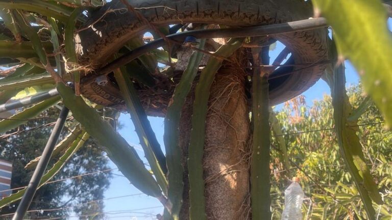 तेलंगाना में ड्रैगन फ्रूट किसानों द्वारा प्रयुक्त रबर टायरों को ट्रेलिस-टॉप के रूप में पुन: उपयोग किया गया