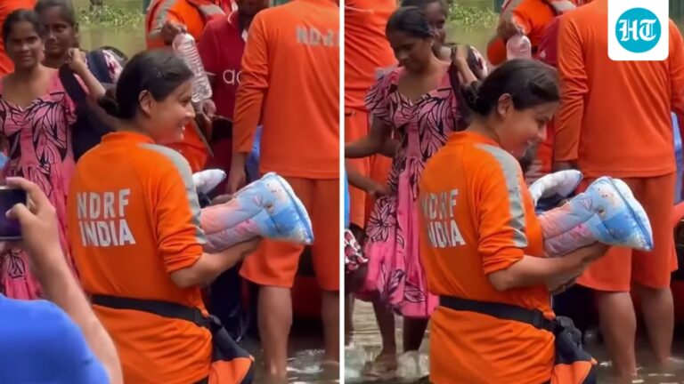 वायरल वीडियो में भारतीय बचावकर्मी बाढ़ प्रभावित श्रीलंका में बचाए गए शिशु को धीरे से गोद में उठा रहे हैं