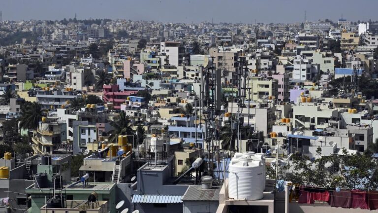 बेंगलुरु में इमारतों का हवाई दृश्य। ई-खाता पर संपत्तियों के पंजीकरण में समस्याओं के बीच, पंजीकरण से राजस्व संग्रह में...